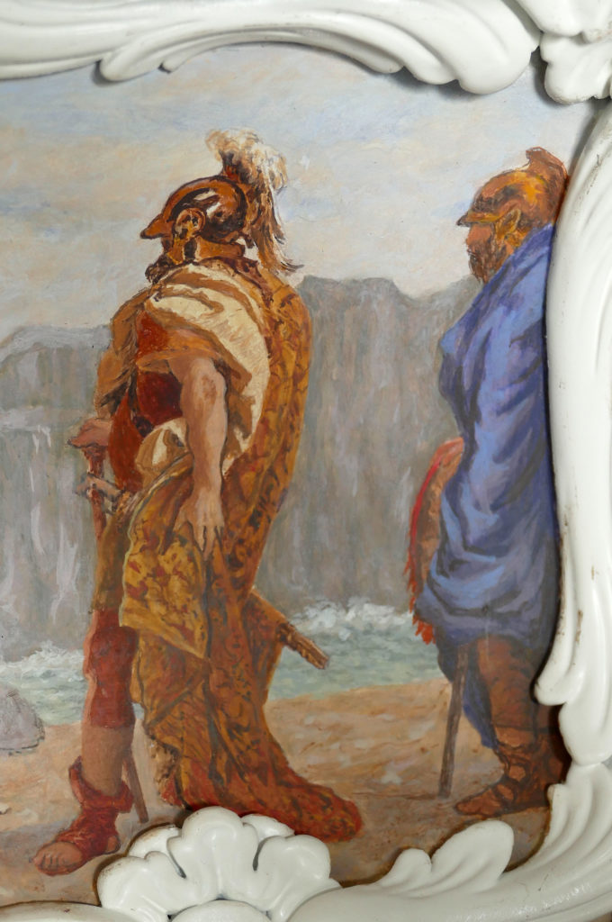 Pour les Ateliers Gohard, Frank a peint une commode de miniatures d’après Tiepolo, une pure merveille ! Sur les côtés latérales et sur les tiroirs d’un modèle galbé, toute une série de peintures des plafonds peints a fresco et des toiles grand format du grand peintre, réduits à petite taille.